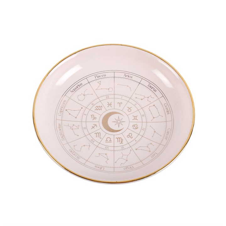 This beautiful off-white trinket dish depicts the astrology wheel in intricate, gold effect detail for a premium look. A gorgeous piece for storing treasured trinkets and jewellery, and a finishing touch for any home with celestial-inspired decor.