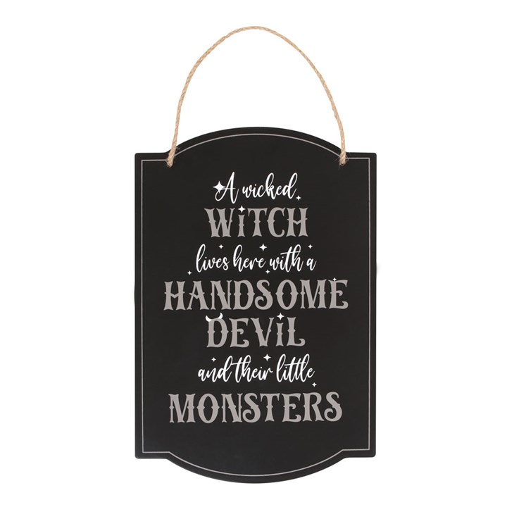 This quirky hanging sign is the perfect way to decorate for a spooktacular Halloween with fun ‘A Wicked Witch Lives Here with a Handsome Devil and Their Little Monsters’ text accented with a dash of magic. Perfect for a door or entryway, this sign is a must-have for any family of ghouls.